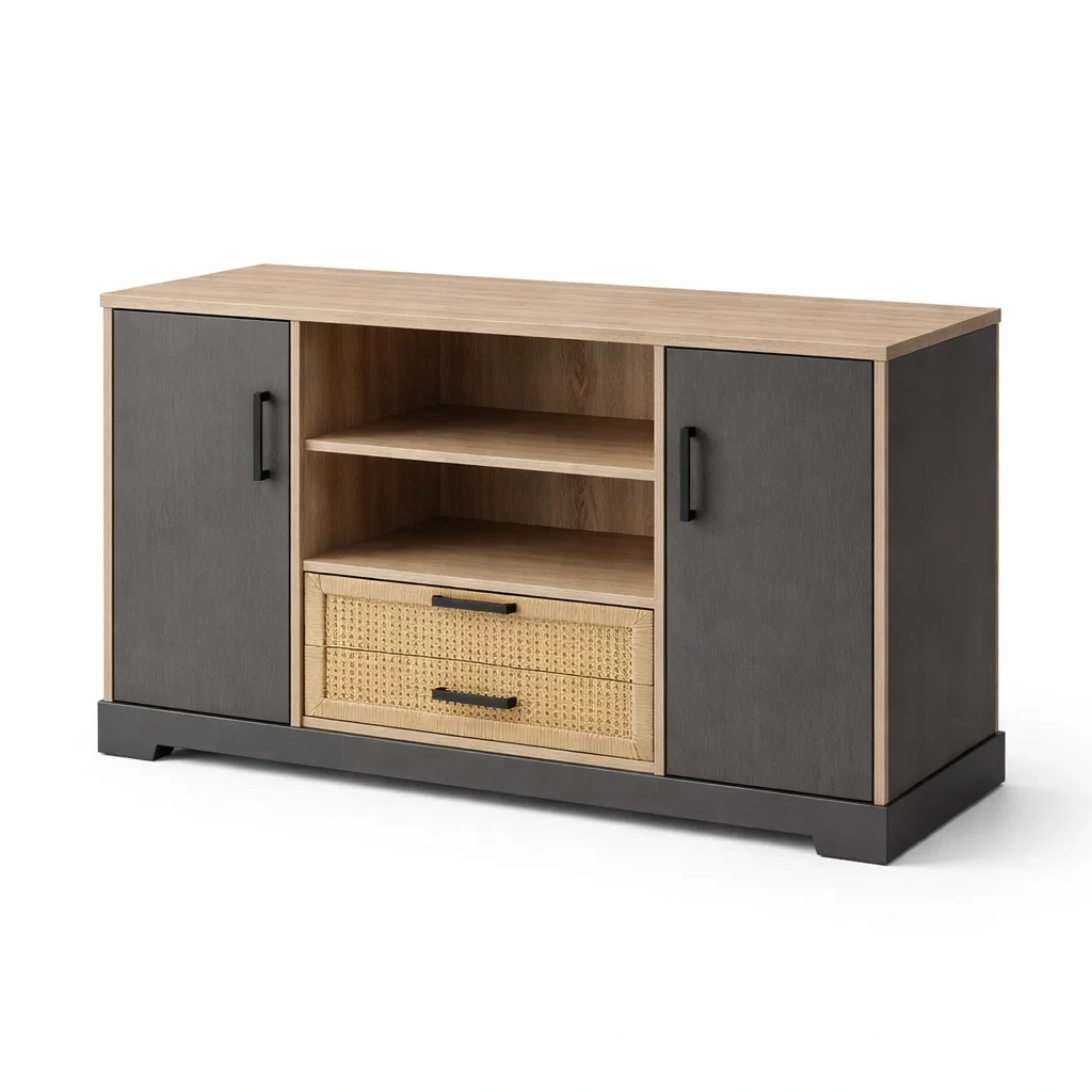 Buffet en mdf et rotin avec portes et tiroir en gris et chêne