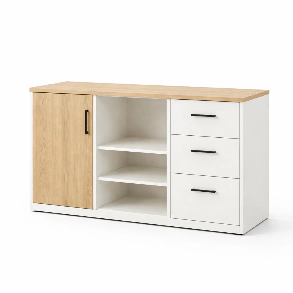 Buffet en mdf blanc et chêne avec tiroirs et porte